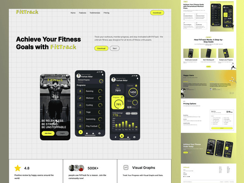 The landing page for the FitTrack app emphasizes fitness tracking, personalized workout plans, and real-time progress monitoring. It combines a modern, visually engaging design with user-focused features to attract and retain fitness enthusiasts.