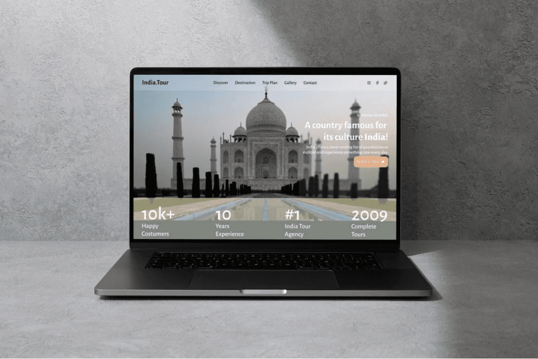 The landing page for the India Tour Agency highlights India's rich cultural heritage, breathtaking landscapes, and travel opportunities. It aims to captivate users through visually immersive storytelling and strategically placed CTAs to encourage bookings.